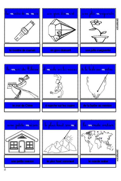 de chaque dessin (telle qu’elle est écrite sur la fiche au-dessus du dessin, par exemple : “la montre de maman”, “un gros diamant, une jolie marguerite, ... “il marche sur les mains”, etc., certains enfants étant capables, à ce niveau, de déchiffrer) ; la discussion est ouverte et prétexte à faire prononcer le plus souvent possible les différents mots ; l’adulte prend soin d’écrire au tableau (ou sur une feuille) les légendes des dessins, et les fait relire à l’enfant ;